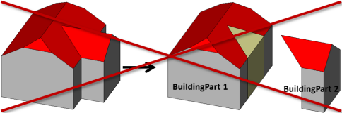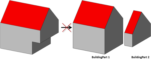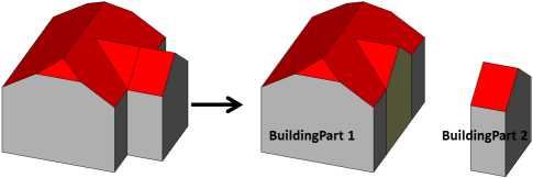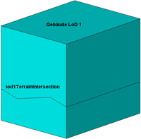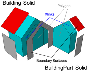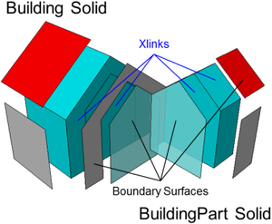 - Generalisierte Außenhülle (vertikale seitliche Begrenzungsflächen) mit prototypischer Dachform. Grundflächen, Wandflächen, Dachflächen, äußere Decken, äußere Böden, virtuelle Flächen und Gebäudeinstallationen (Balkone, Dachgauben, Schornsteine, ...) können als semantische Objekte repräsentiert sein.