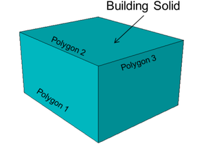 - Für jedes Gebäude/Gebäudeteil wird die generalisierte Außenhülle durch genau einen Extrusionskörper (prismatisches Blockmodell) repräsentiert. Grund- und Bodenfläche sind horizontal und die seitlichen Begrenzungsflächen vertikal.